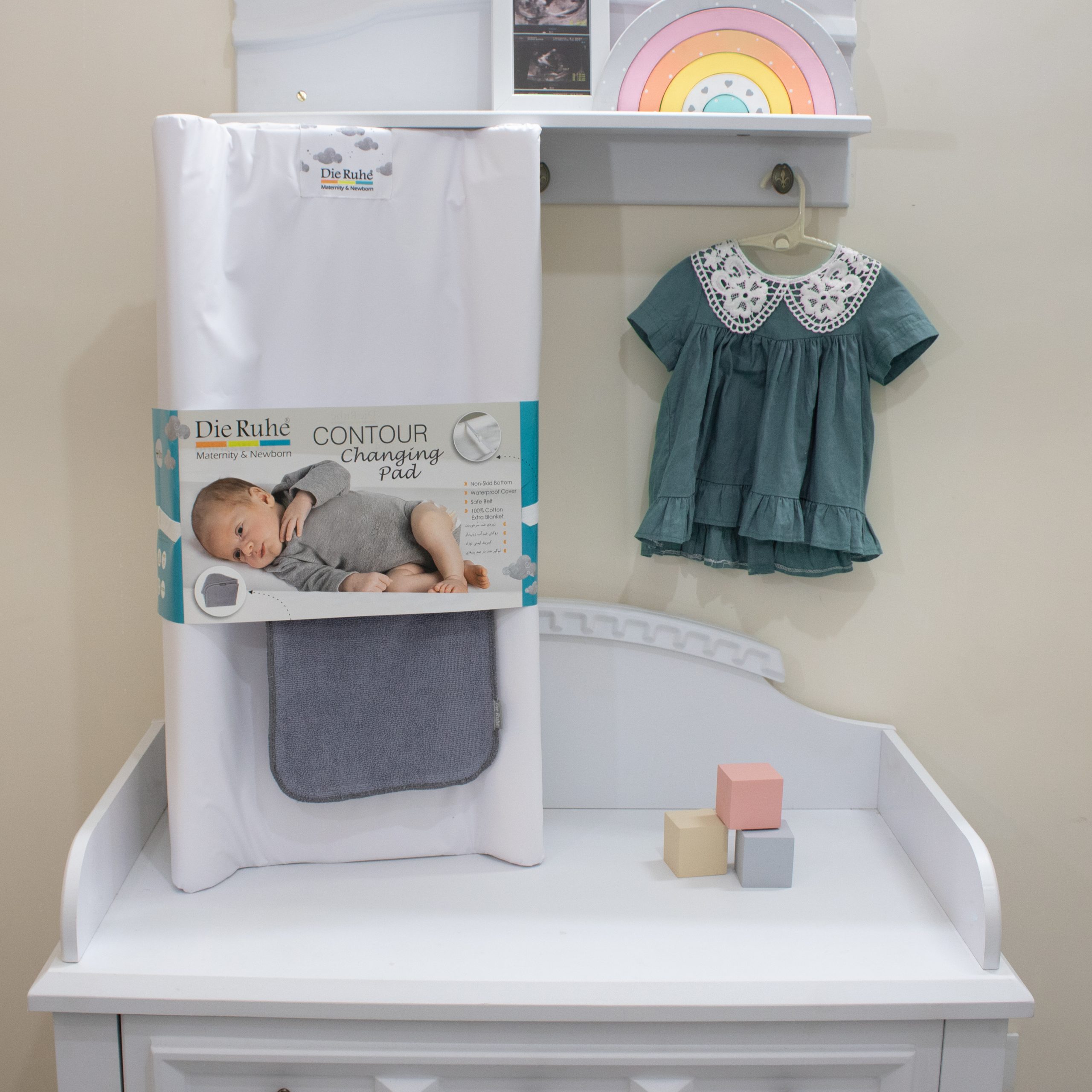 تشک تعویض لبه دار محصول جدید دی روحه است. این تشک با ابعاد 40 در 80 برای استفاده بر روی کمد های تعویض نوزاد و کودک طراحی شده است و به روشهای امنی بر روی کمد تعویض ثابت می شود. روکش تشک کاملا ضدآب بوده و به راحتی قابل جداشدن و شستشو می باشدو همراه با این محصول یک حوله به ابعاد 25 در 35 هم وجود دارد که از جنس صد در صد پنبه است و استفاده از این محصول را راحت تر می کند. همچنین این تشک دارای کمربندی است که با نگه داشتن دستهای کودک کمک می کند به راحتی پوشک را تعویض کنید.